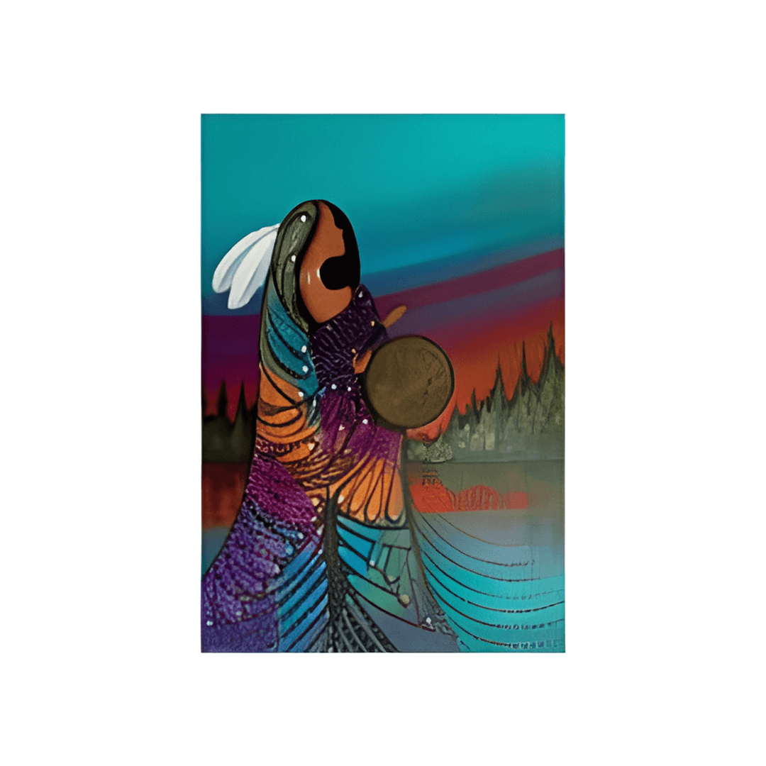 This 4" x 6" blank note card features the artwork of Betty Albert, a Cree artist celebrated for her faceless figures that evoke tradition, action, and deep spirituality. A thoughtful addition to any collection of Indigenous giftware, this card is perfect for sending meaningful messages to loved ones, offering a personal touch that highlights authentic cultural artistry.