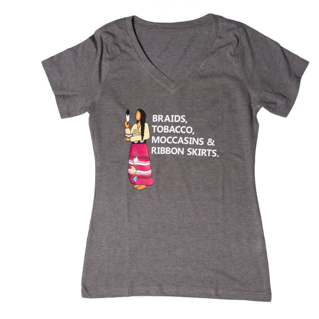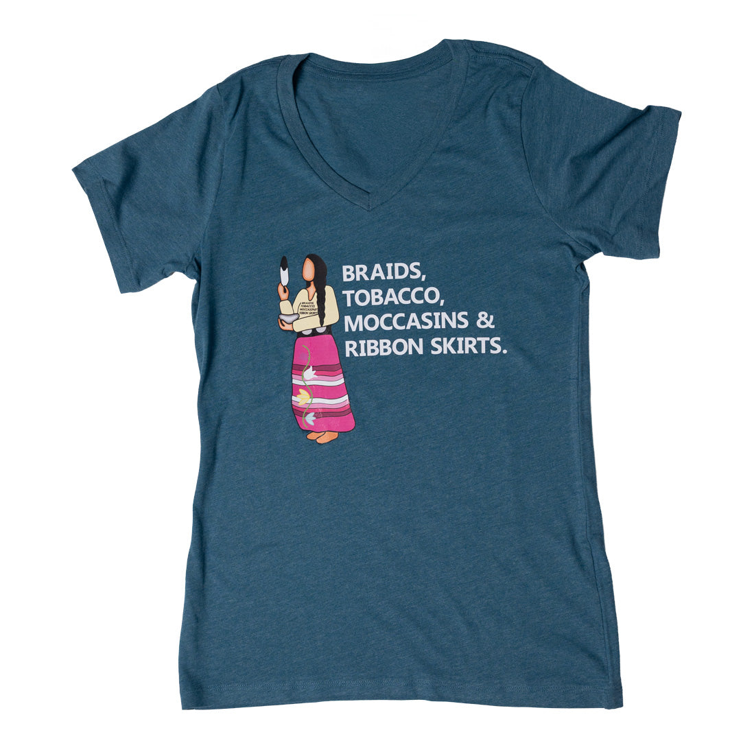 Braids Tobacco Moccasins & Ribbon Skirts V-neck