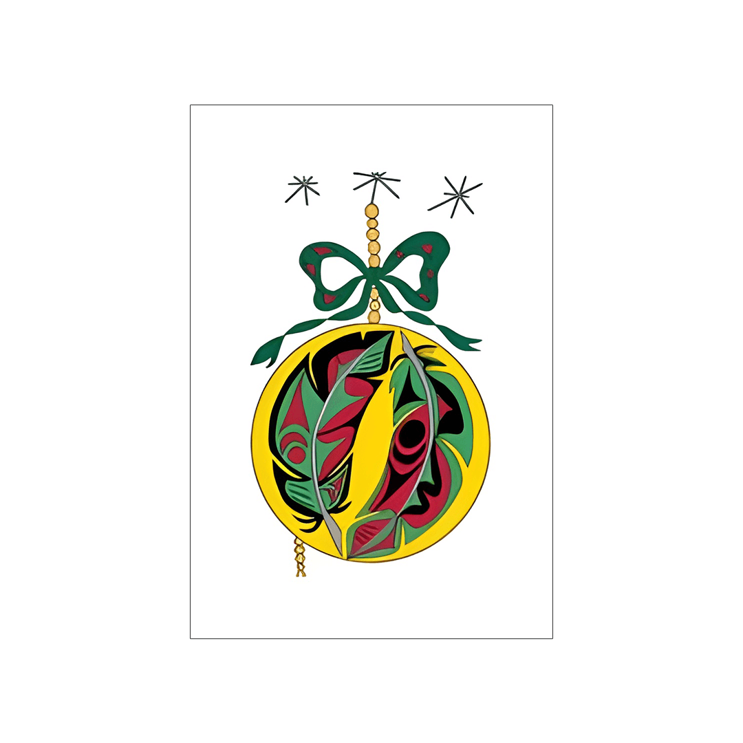 This 4" x 6" blank note card features the artwork of Angela Kimble, a Coast Salish artist whose designs beautifully blend tradition and holiday spirit. A thoughtful addition to any collection of Indigenous giftware, this card is perfect for sending heartfelt holiday messages to loved ones, showcasing authentic cultural artistry with a festive touch.