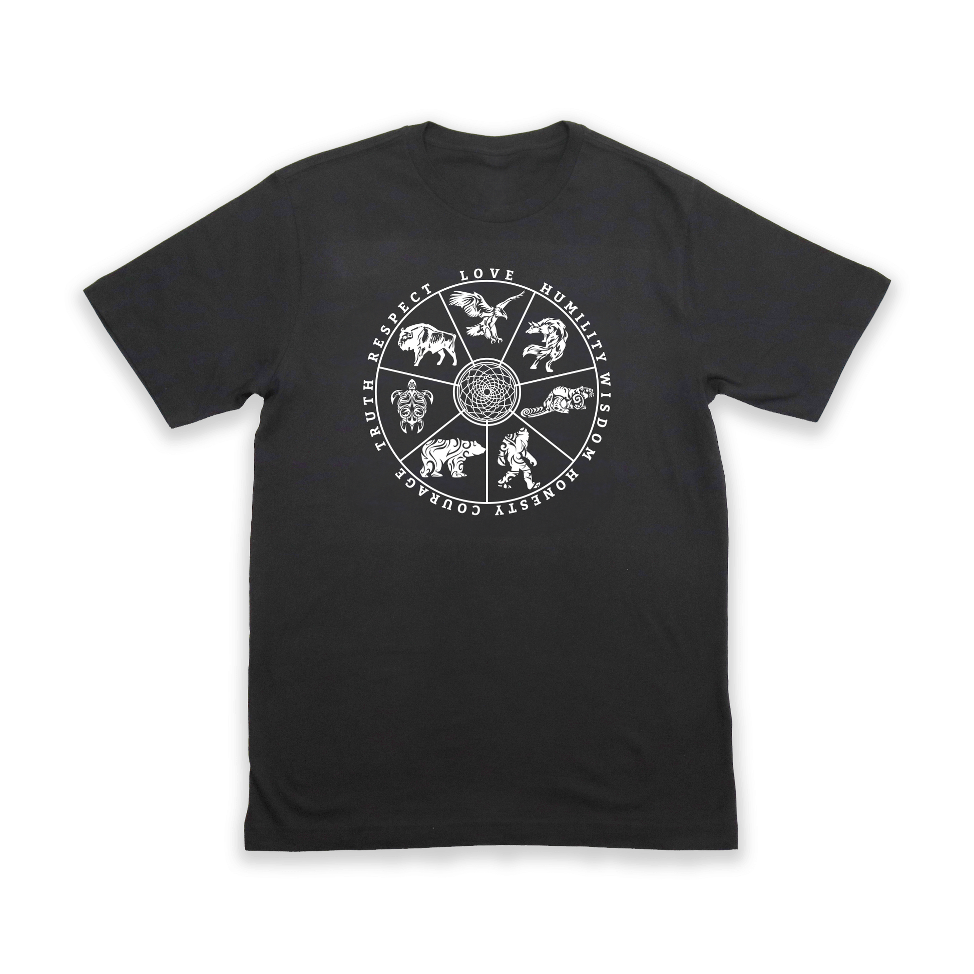 This Seven Teachings Tee embodies the teachings of wisdom, love, respect, bravery, honesty, humility, and truth. Made with the highest quality materials, it offers comfort and durability. Show your respect to indigenous cultures and promote positive values with this unique and meaningful tee.