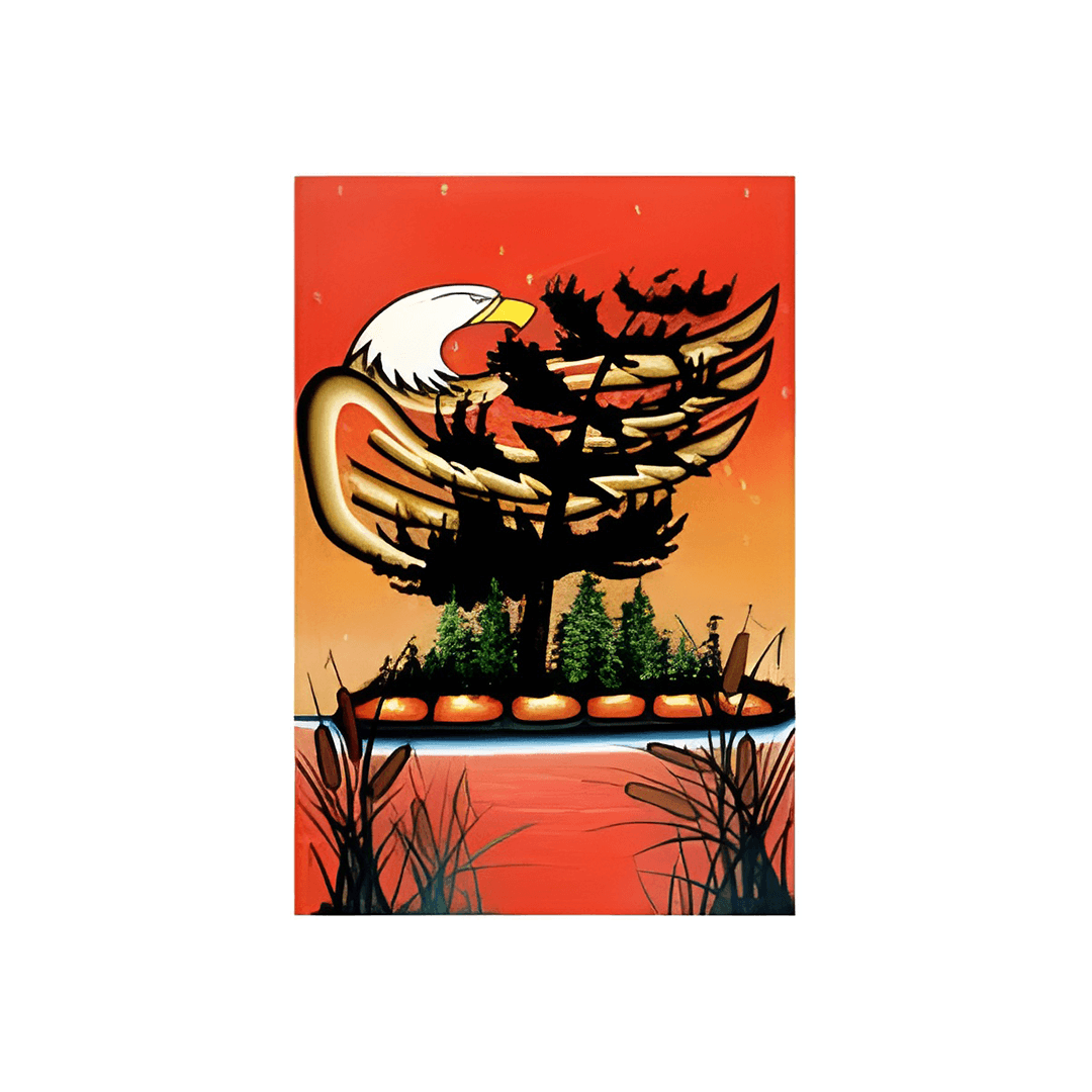 This 4" x 6" blank note card features the artwork of William Monague, an Ojibway artist whose designs beautifully embody the spirit and majesty of eagles, a symbol of strength and vision in Indigenous culture.